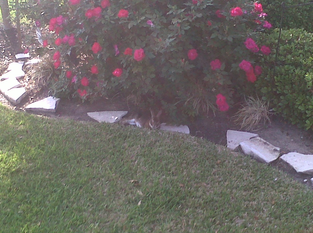 The next week begins and ever since that first encounter with Peter Rabbit it looks like this visitor continues to show up under the rose bush when we get home after work.  So, eight days later, this rabbit has taken up residence at my house.