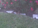 We take a look at the rabbit for a bit than go in the house. The weekend comes. Every morning and afternoon the visitor rabbit shows up. He gets to our house in the morning hours than camps out underneath the rose bush. As the sun sets he moves his location to the shrubbery closer to the house for more shade.
